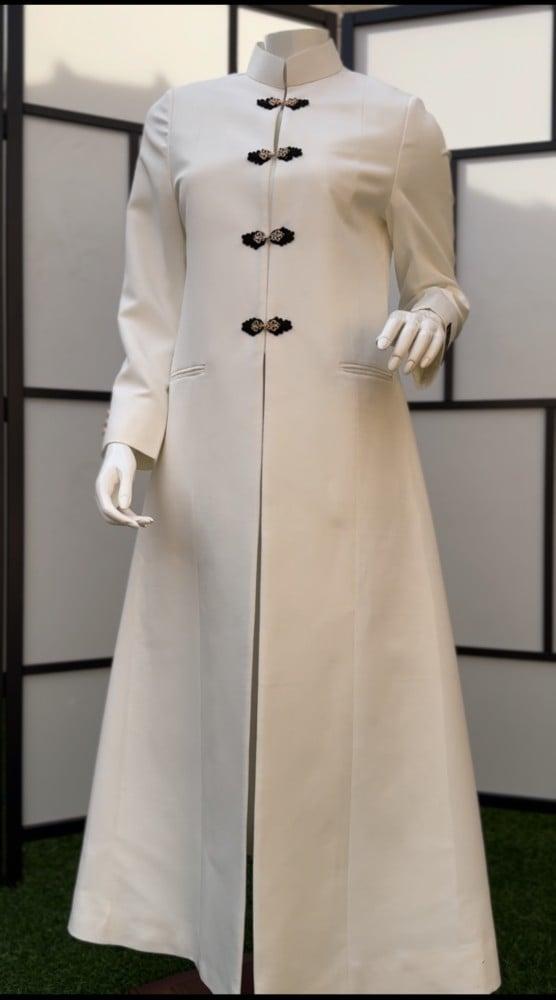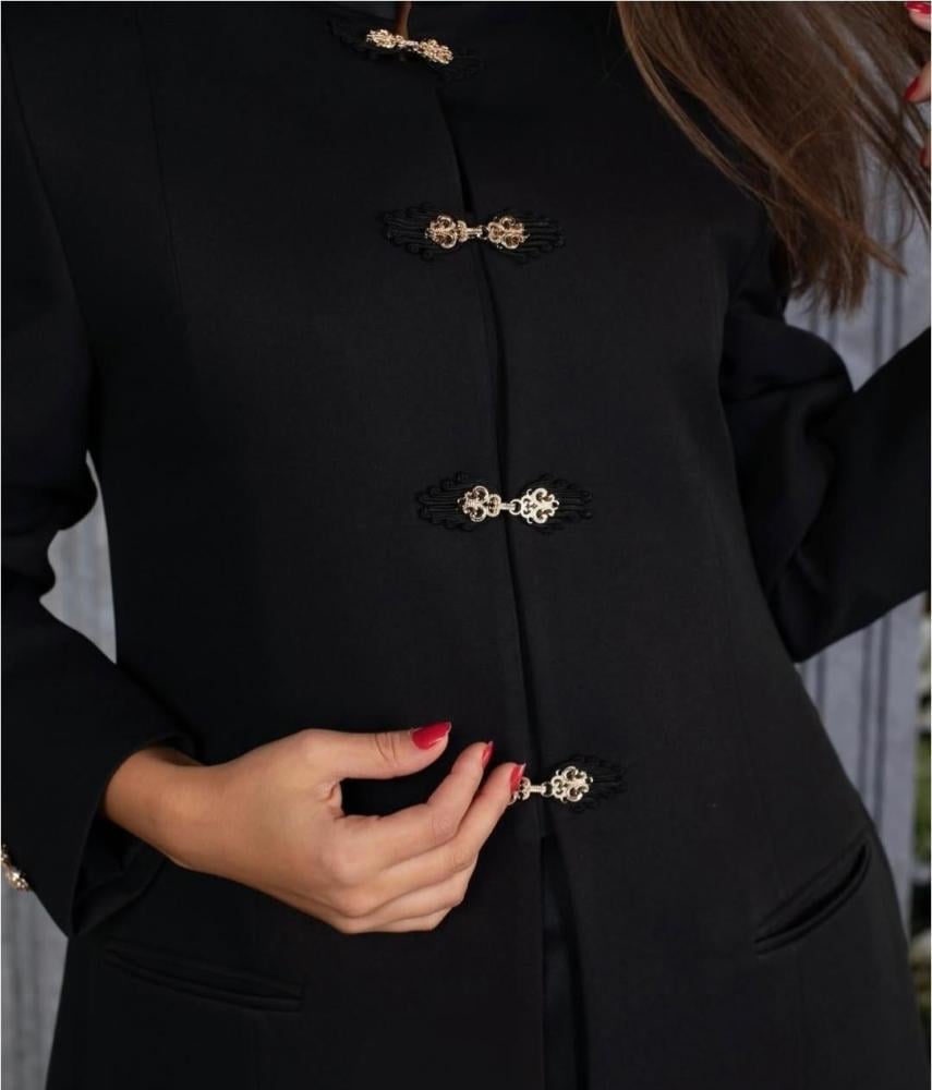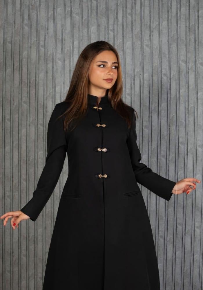 عباية بليزر راقية ومميزة باللون الأسود وبقماش كريب إيطالي مناسب لفصل الصيف . مزينة بقيطان أسود مع جزء معدني ذهبي لإغلاق العباية . وقصة Aline أنيقة ومميزة مناسبة لأوقات الدوام والعمل والمناسبات الرسمية .