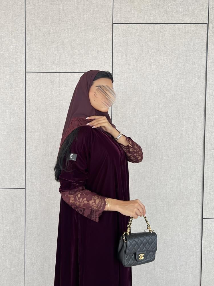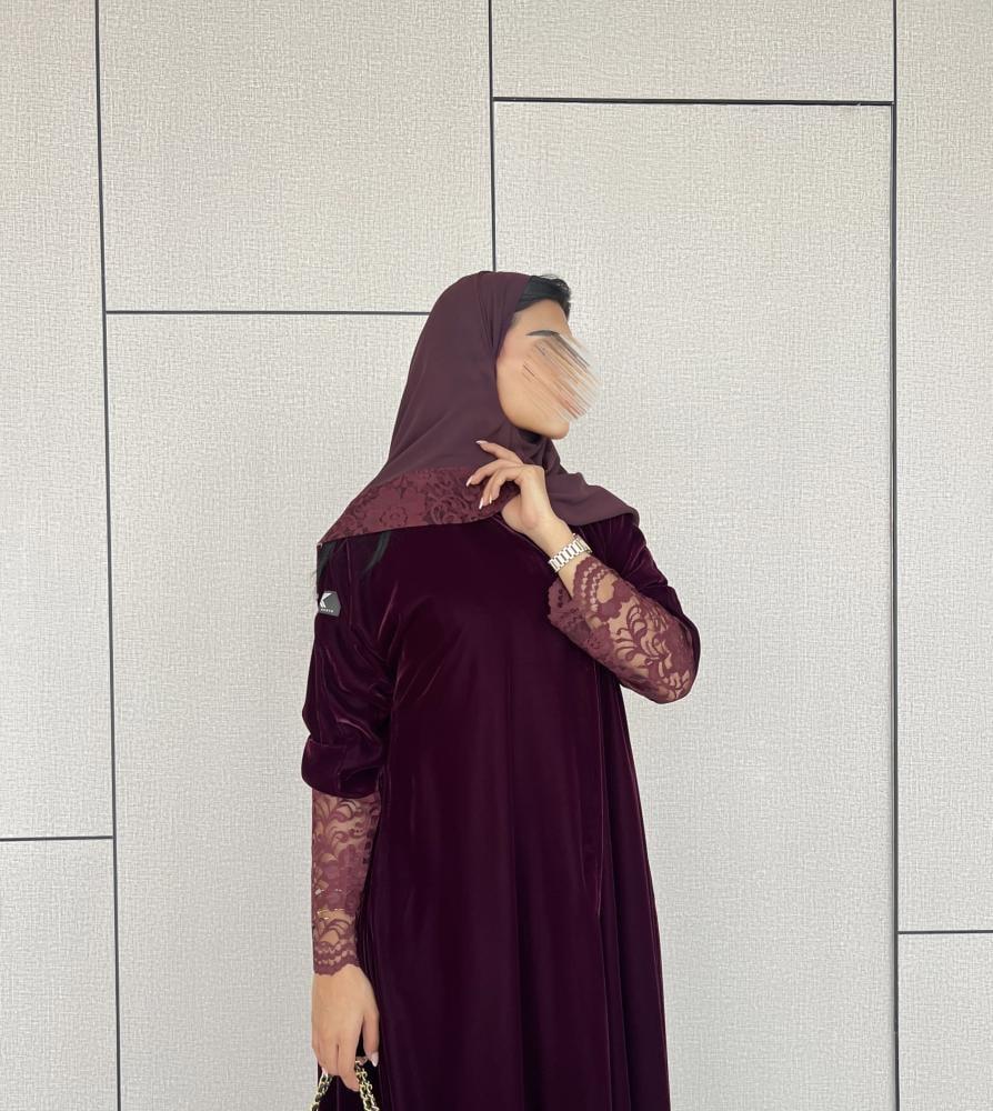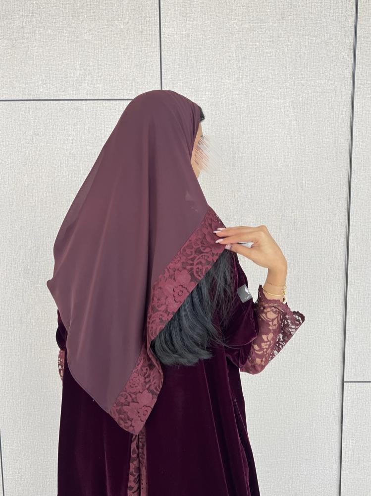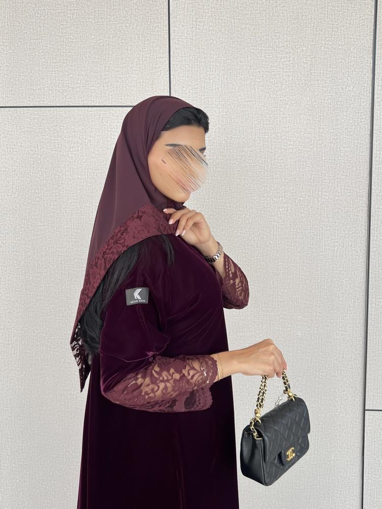 القماش: مخمل كوري عنابي على موف مع دانتيل عنابي على العباية وطرف الطرحة