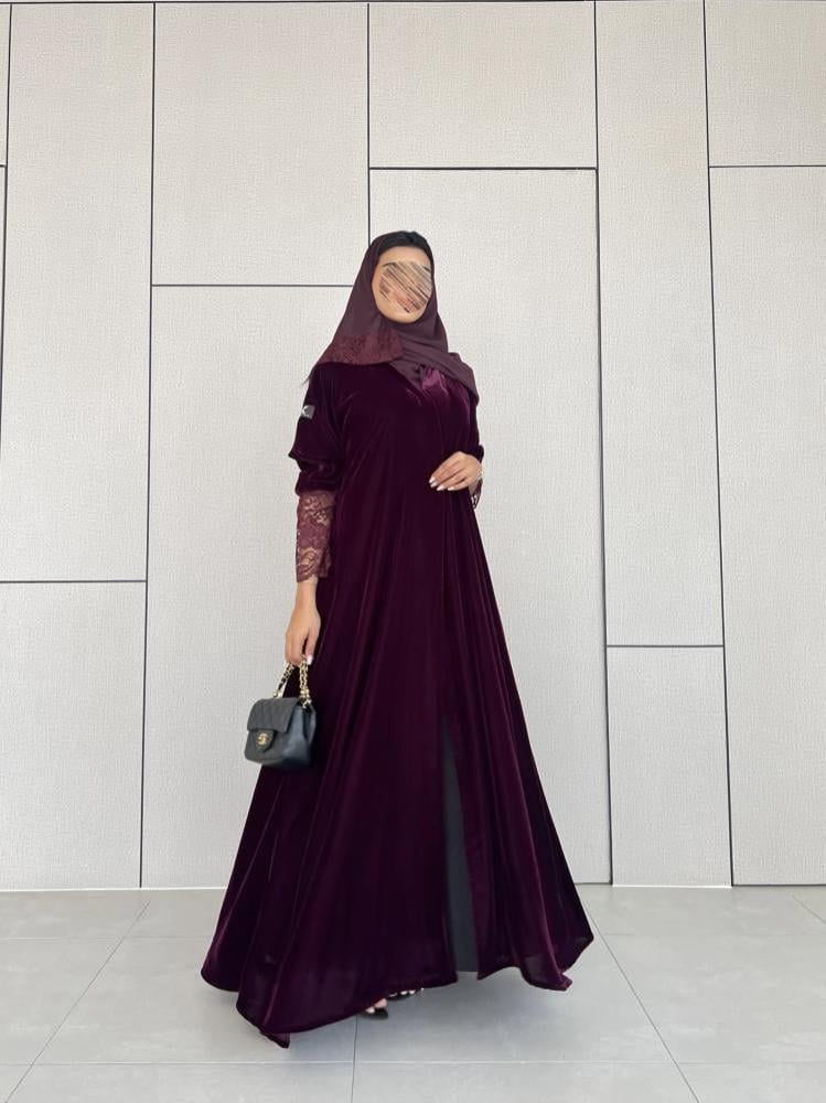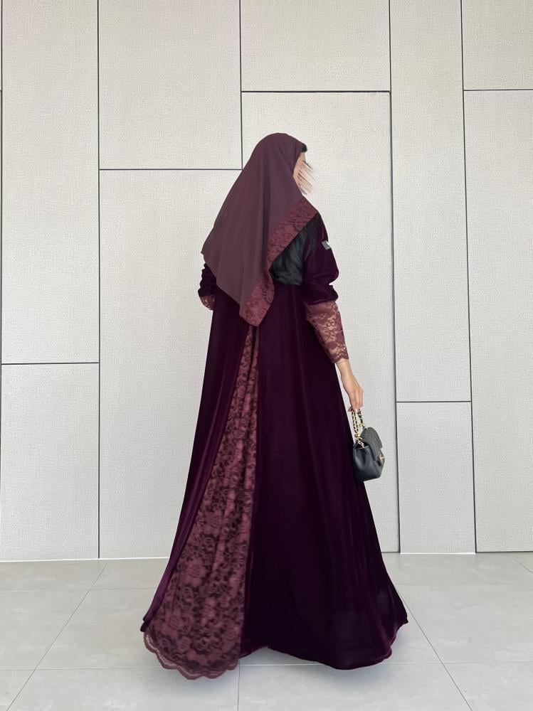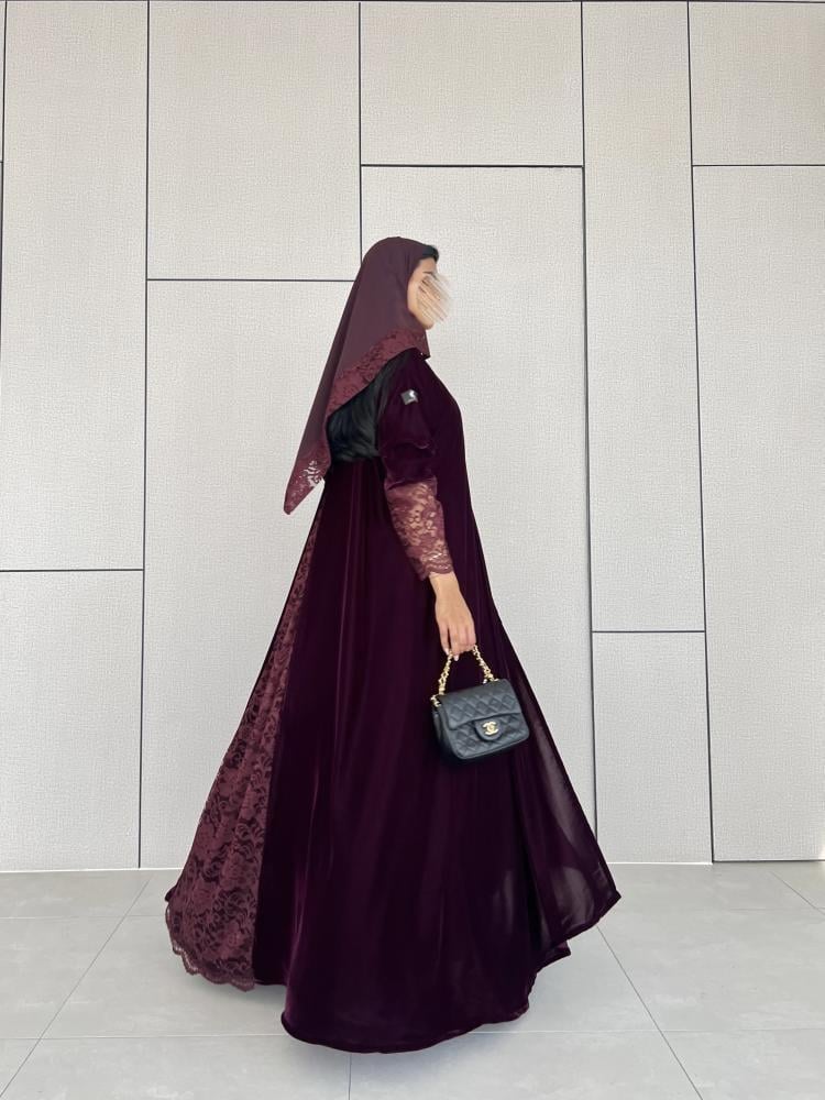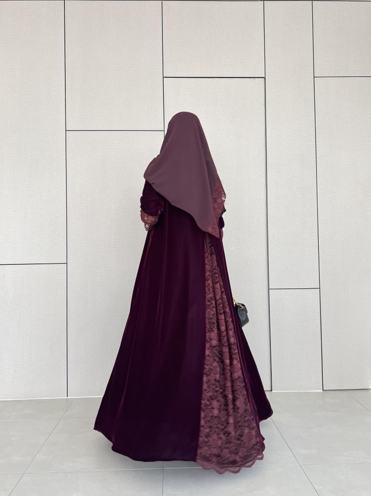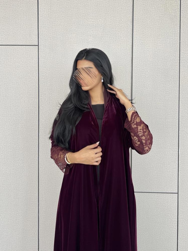 القماش: مخمل كوري عنابي على موف مع دانتيل عنابي على العباية وطرف الطرحة