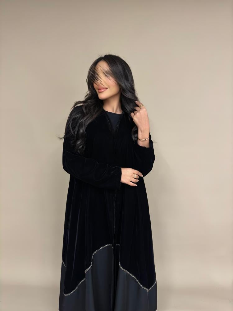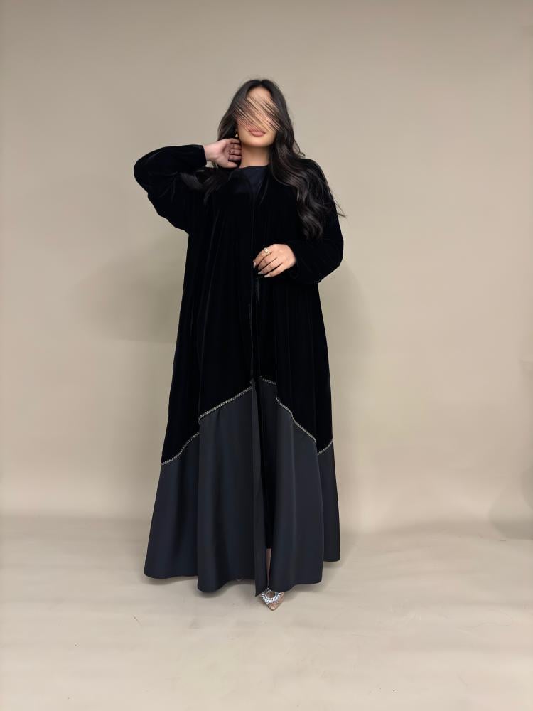 عبايه مخمل كوري بتطريز يدوي +كتان تاوياني.