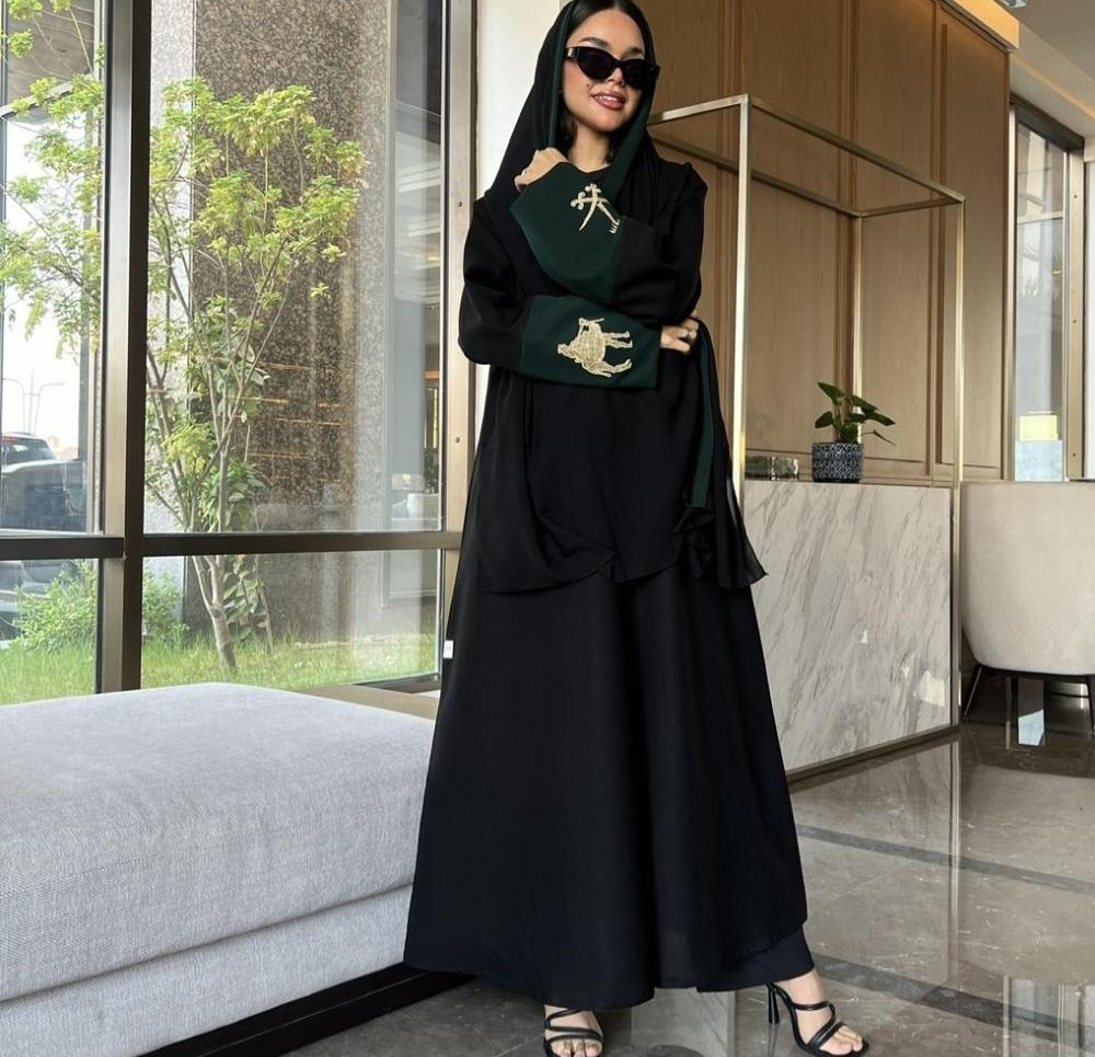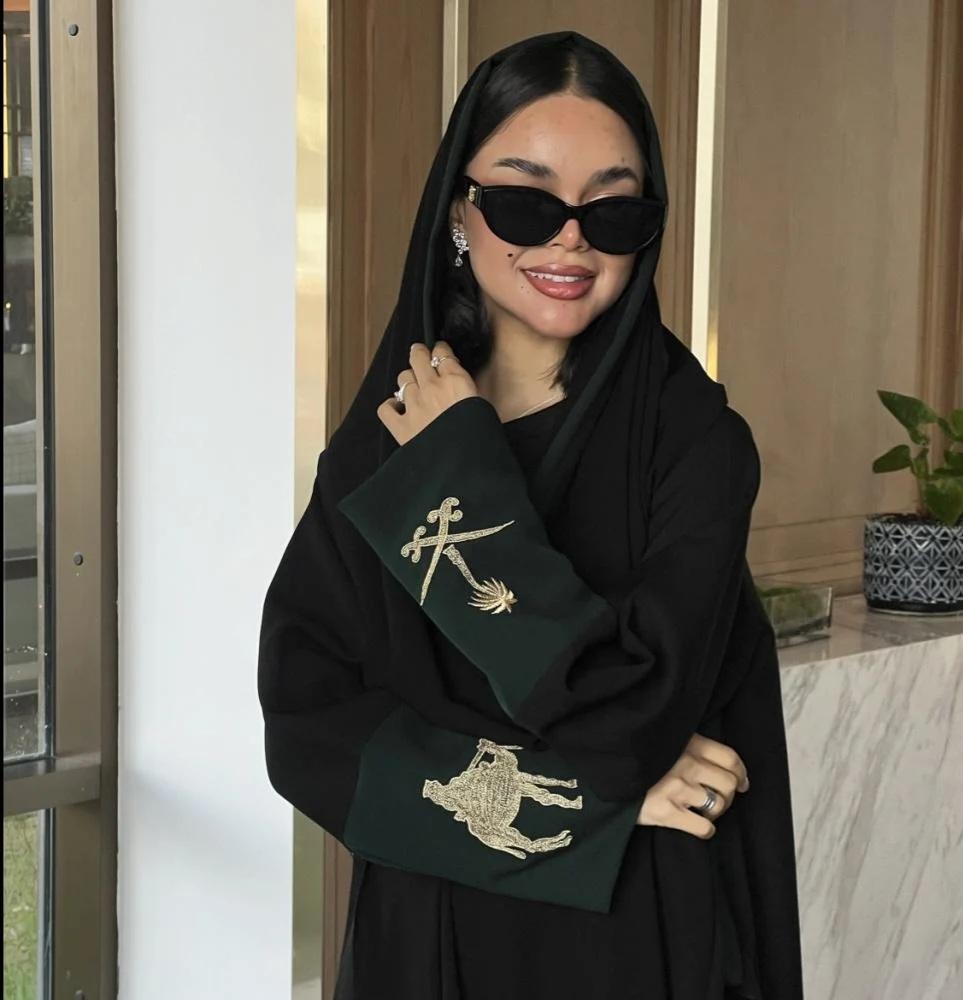 عباية ملكية فخمة باللون الأسود، أكمامها مزيّنة بتطريز ذهبي فاخر يعكس الهوية السعودية بروح اليوم الوطني. التصميم بسيط وأنيق، مع لمسات خضراء على الأكمام تزيدها تميّز وفخامة. مناسبة لكل مناسباتك، وتعطيك حضور راقي ولمسة وطنية تلفت الأنظار."